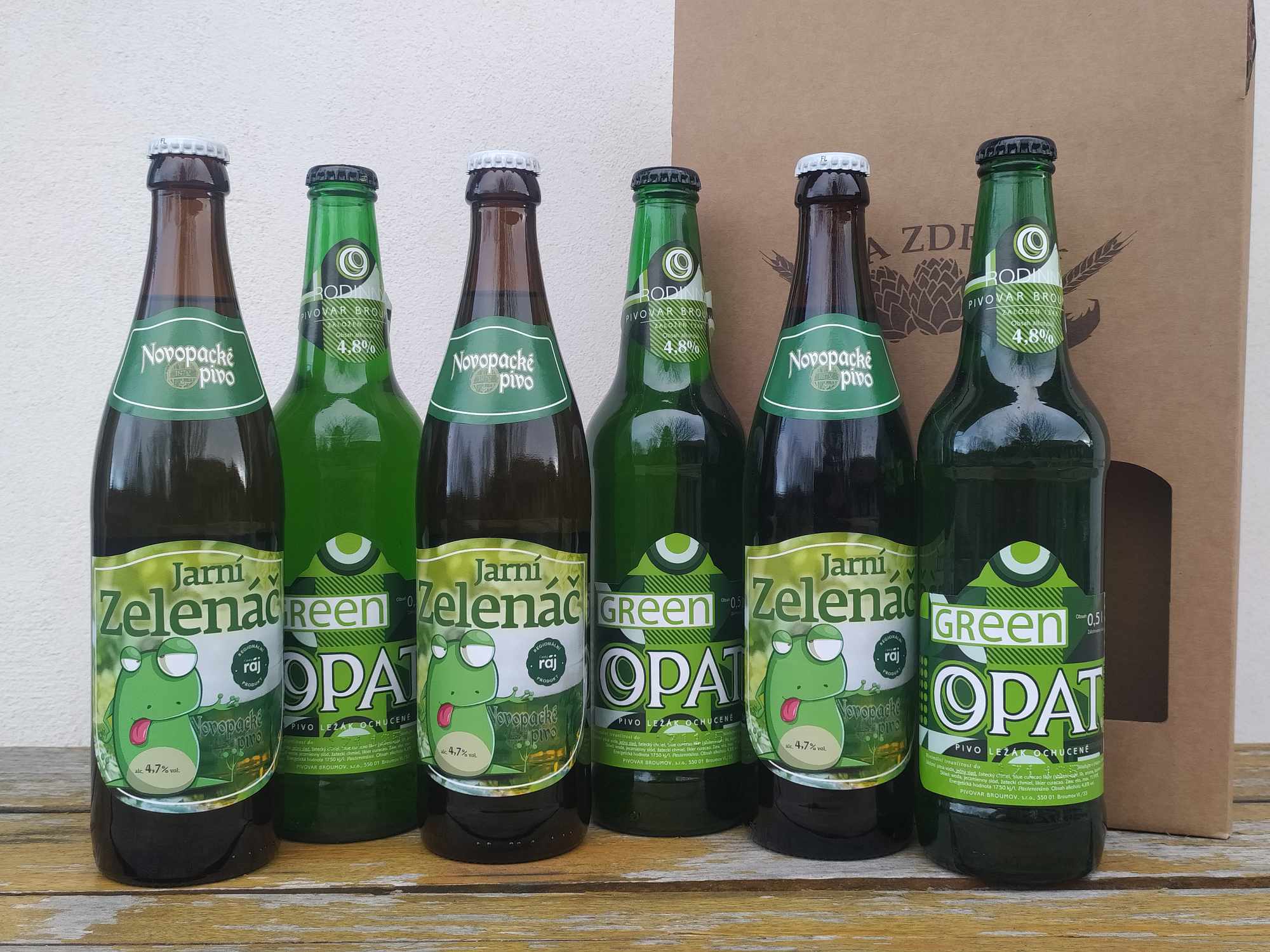 3 zelená velikonoční piva z pivovaru Opat v Broumově a 3 zelené 11% Jarní zelenáč z pivovaru v Nové Pace.